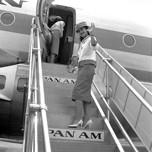 MISS SINGAPORE - MARION WILLIS - LEFT FOR LONG BEACH CALIFORNIA ON A PAN-AMERICAN AIRLINER, WAVING FAREWELL FROM AN HONOURED PLACE IN THE COCKPIT. MARION LOOKED STUNNING IN A SACK-SUIT OF WHITE AND ORANGE WITH A MATCHING ORANGE HAT. IN HER HAND SHE HELD A GOLD HORSE-SHOE TIED WITH EMERALD RIBBON GIVEN HER FOR GOOD-LUCK BY A CLOSE FRIEND.] EXTRACT FR TEXT: [MARION LOOKED STUNNING IN A SACK-SUIT OF WHITE AND ORANGE WITH A MATCHING ORANGE HAT. IN HER HAND SHE HELD A GOLD HORSE-SHOE TIED WITH EMERALD RIBBON GIVEN HER FOR GOOD-LUCK BY A CLOSE FRIEND.]