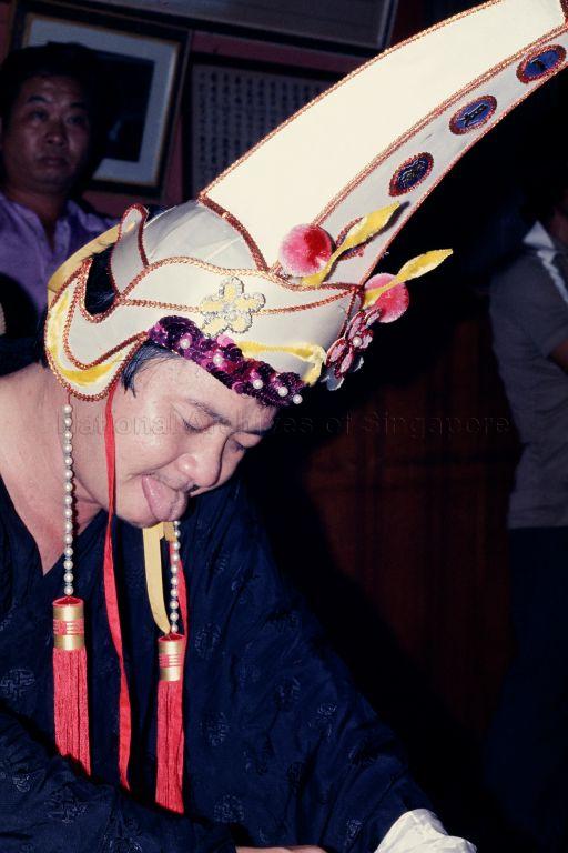 SERIES OF PHOTOGRAPHS SHOWING TEMPLE MEDIUM "AH HUI", POSSESSED BY THE DEITY "TWA YA PEH" AND WITH TONGUE STICKING OUT, WRITING TALISMANS AT A CLARKE QUAY TEMPLE DURING A FESTIVAL.