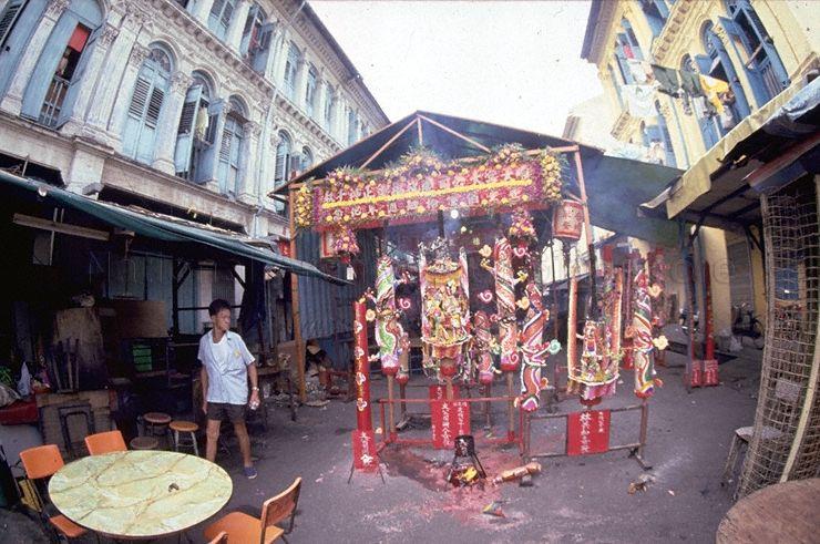 CLOSEUP OF A TEMPORARY TENT ERECTED ON BUGIS STREET FOR A TAOIST CELEBRATION.