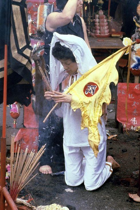 A FEMALE MEDIUM POSSESSED BY THE GODDESS OF MERCY "KWAN YIN" KNEELS IN FRONT OF AN ALTAR AT BUKIT MERAH.