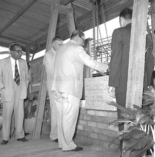 MINISTER FOR HEALTH A J BRAGA LAYING THE FOUNDATION STONE OF THE HOSPITAL OF THE CHRONIC SICK AT THOMSON ROAD