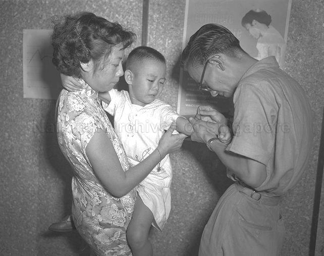 SMALLPOX VACCINATION AT TIONG BAHRU CLINIC. SMALLPOX REACHED EPIDEMIC PROPORTIONS WHEN A TOTAL OF SEVEN CASES OF THE DISEASE WERE CONFIRMED. SO FAR, ALL THE KNOWN CASES CAME FROM FOUR HOUSES IN THE SAME AREA OF KAMPONG ALEXANDRA