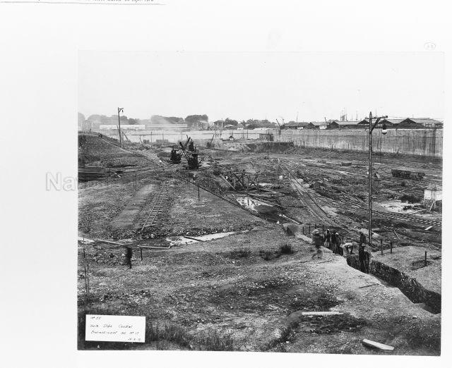 NO. 55: NORTH SLOPE CENTRAL EMBANKMENT AS NO. 17, 28.8.12. LOOKING TOWARDS CONSTRUCTED WALL, ELECTRIC LIGHT HANGING FROM POST, FIGURES, RAIL TRACKS; TEXT: 'RECEIVED WITH TOPHAM, JONES, & RAILTON'S LETTER DATED 30TH SEPT 1912'