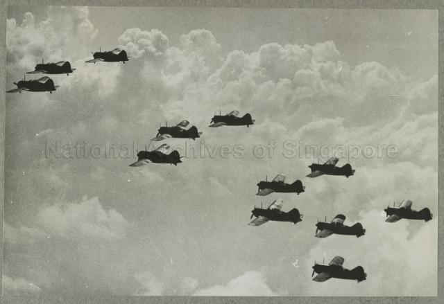 AMERICAN BREWSTER BUFFALO FIGHTER PLANES FLYING IN FORMATION OVER MALAYA.