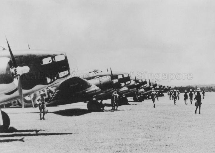 A LINE UP OF LOCKHEED HUDSON BOMBER AIRCRAFT OF NO. 8 SQUADRON RAAF ON THE AIRFIELD ON THE ISLAND OF SINGAPORE.