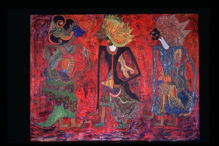 WAYANG ART TITLED BISMA, SANTANU AND DEWI GANGGA (RED), OIL ON CANVAS