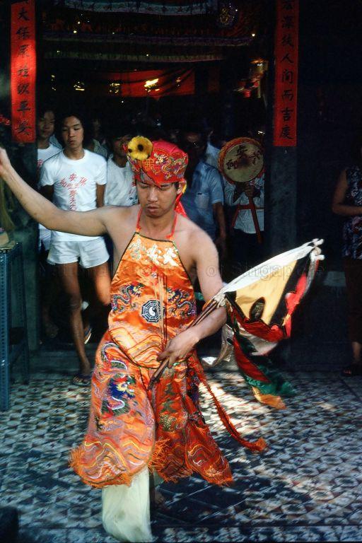 A MEDIUM POSSESSED BY "TAI SENG YA" THE MONKEY GOD ARRIVING AT THE "SENG ONG BIO" TEMPLE IN PECK SEAH STREET AFTER A PROCESSION