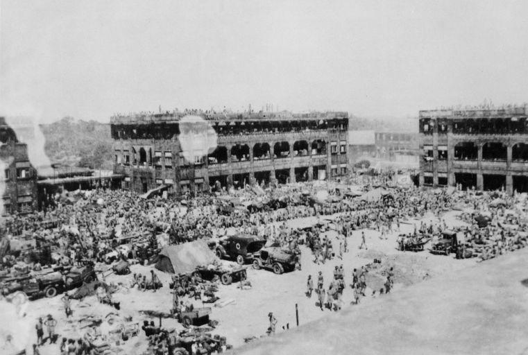 AIF AND BRITISH POW, SELARANG BARRACKS, CHANGI, SINGAPORE. TROOPS ARRIVING IN SELARANG BARRACKS SQUARE