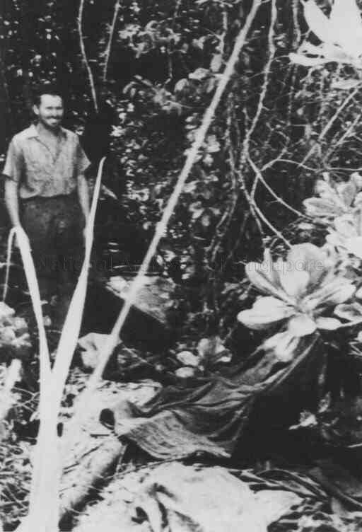 STRAITS SETTLEMENTS. A MEMBER OF "Z" SPECIAL UNIT, AUSTRALIAN SERVICES RECONNAISSANCE DEPARTMENT, ALONGSIDE A TWO MAN CANOE HIDDEN IN THICK JUNGLE, PRIOR TO THE IMPLEMENTATION OF A SUCCESSFUL RAID ON JAPANESE SHIPPING IN SINGAPORE HARBOUR BY THREE SUCH CANOES.
