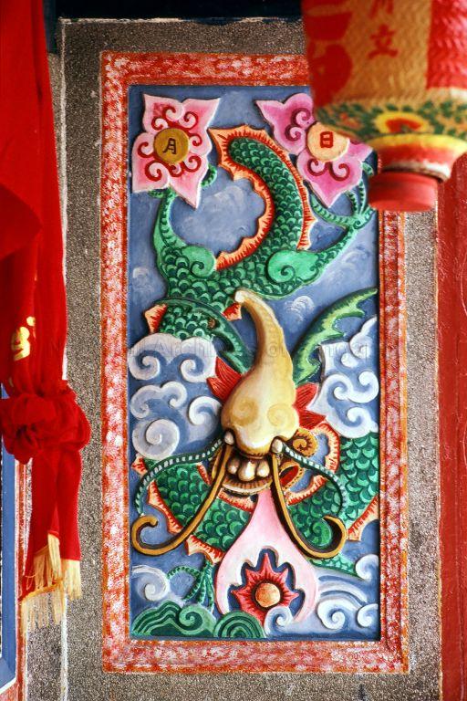 NINE EMPEROR GODS TEMPLE AT UPPER SERANGOON ROAD -- COLOURFUL DETAIL OF DRAGON AT THE ENTRANCE
