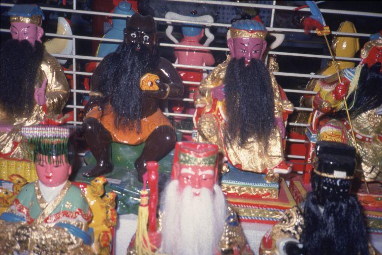A GROUP OF STATUES OF CHINESE DEITIES. WITH BLACK FACE IS PAN GU