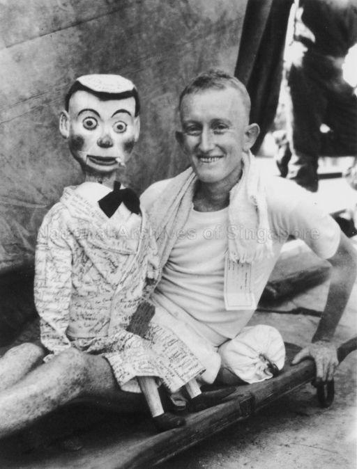 SINGAPORE. PRISONERS OF WAR RELEASED FROM CHANGI PRISON CAMP WERE EVACUATED FROM SINGAPORE BY THE AUSTRALIAN HOSPITAL SHIP "MANUNDA", THE FIRST AUSTRALIAN SHIP TO ARRIVE AT SINGAPORE AFTER THE SURRENDER OF THE JAPANESE. SHOWN, GUNNER T. HUSSEY, 2/10 FIELD REGIMENT WAITING ON A STRETCHER TO BOARD THE "MANUNDA". HIS VENTRILOQUIST DOLL "JOEY" IS THE LAST OF THREE HE MADE WHILE IN CHANGI CAMP.