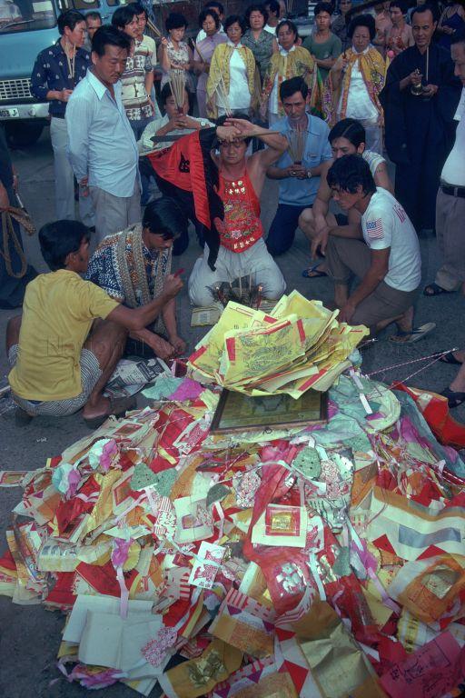MEDIUM "AH HOOI" POSSESSED BY THE DEITY THE THIRD PRINCE, KNOWN AS "LA CHA" IN HOKKIEN, PERFORMING A RITUAL IN FRONT OF A PILE OF JOSS PAPER AND TALISMANS TO BE BURNT, AT CLARKE QUAY