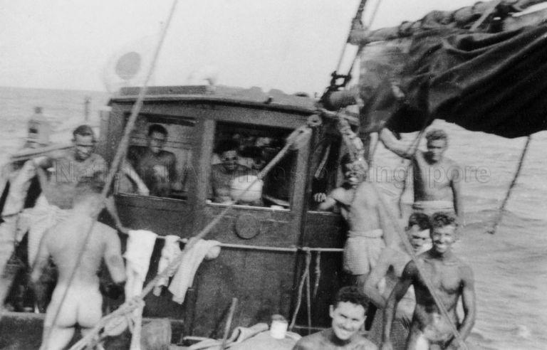 SINGAPORE, STRAITS SETTLEMENTS. MEMBERS OF "OPERATION JAYWICK", "Z" SPECIAL UNIT, AUSTRALIAN SERVICES RECONNAISSANCE DEPARTMENT, ON BOARD THE MV. "KRAIT" EN-ROUTE FOR JAPANESE OCCUPIED SINGAPORE WHERE A SUCCESSFUL RAID WAS CARRIED OUT ON SHIPPING IN THE HARBOUR BY MEANS OF LIMPET MINES BEING ATTACHED TO THE UNDERSIDE OF VESSELS BY DARING TWO MEN CREWS IN FOLBOATS. HERE THE MEN CAN BE SEEN STAINING THEIR BODIES IN PREPARATION FOR THE RAID.