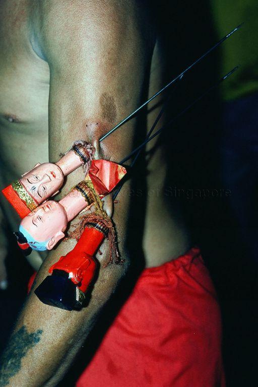 CLOSE-UP OF MEDIUM'S ARM PIERCED WITH THREE SPIKES BEARING WOODEN HEADS OF "THE GENERALS OF THE FIVE DIRECTIONS"