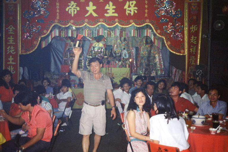 SEVENTH MONTH HUNGRY GHOST FESTIVAL -- AN AUCTIONEER HOLDING UP AN ITEM AND ASKING FOR BIDS DURING A DINNER IN CELEBRATION OF THE FESTIVAL