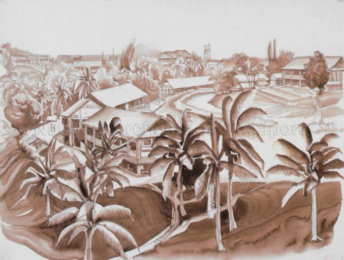 DRAWING BY MURRAY GRIFFIN. GENERAL VIEW FROM SELARANG SQUARE, CHANGI