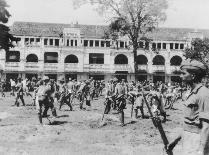 SINGAPORE. JAPANESE POWS FILLING IN SLIT TRENCHES IN THE GROUNDS OF ST ANDREW'S CATHEDRAL AFTER THE RE-OCCUPATION OF SINGAPORE