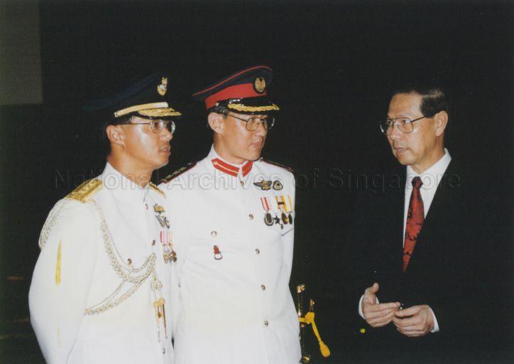 PRESIDENT ONG TENG CHEONG (RIGHT) WITH COMMANDER OF THE OFFICERS' CADET SCHOOL, COLONEL RAYMAN CHIA AND CHIEF OF DEFENCE FORCE, LIEUTENANT-GENERAL BEY SOO KHIANG (LEFT) DURING THE OFFICER CADET SCHOOL TRI-SERVICE COMMISSIONING PARADE RECEPTION AT THE SAFTI MILITARY INSTITUTE
