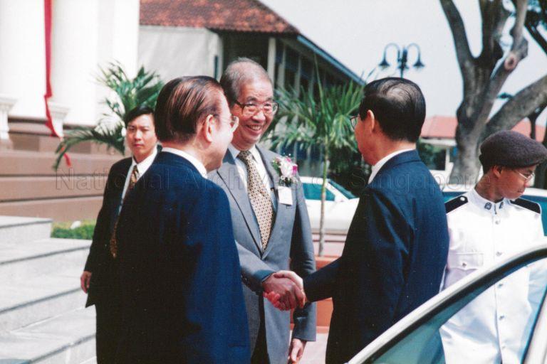 CO-CHAIRMAN OF AWARD ORGANISING COMMITTEE LINN IN HUA (CENTRE) WELCOMING GUEST OF HONOUR PRESIDENT ONG TENG CHEONG FOR THE TAN KAH KEE PRIZE CEREMONY AT CHINESE HIGH SCHOOL. ON THE LEFT IS CO-CHAIRMAN OF THE AWARD ORGANISING COMMITTEE TAN KEONG CHOON.