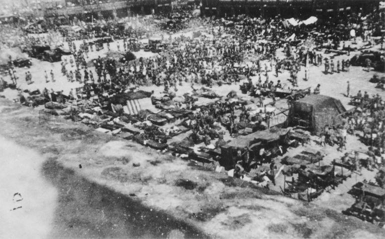 VIEW OF THE SELARANG BARRACKS SQUARE, CHANGI DURING THE SELARANG BARRACKS INCIDENT. SHOWN ARE SOME OF THE 15400 ALLIED POWS WHO WERE CROWDED IN THE SQUARE