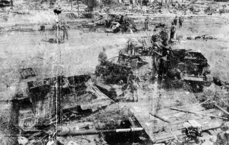 PHOTOGRAPH REPRODUCED IN A JAPANESE PROPAGANDA MAGAZINE ENTITLED "HOME" ILLUSTRATING A REPORT ON THE CAPITULATION OF THE BRITISH FORCES AT SINGAPORE. IT SHOWS JAPANESE TROOPS WITH WRECKED VEHICLES.