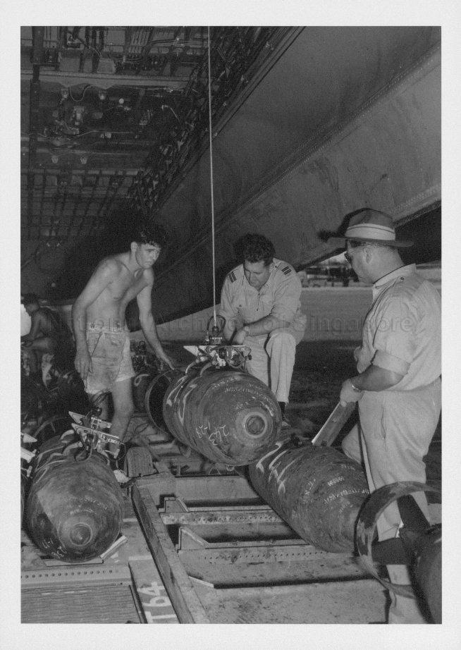 R.A.A.F. AT TENGAH AIRBASE, SINGAPORE. AUSTRALIAN SOLDIERS LOADING BOMBS INTO A LINCOLN BOMBER.