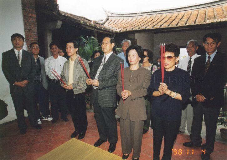 PRESIDENT ONG TENG CHEONG (CENTRE) AND MRS ONG WITH THEIR SON TZE GUAN PAYING HOMAGE IN THEIR ANCESTRAL HOME AT HENG SHAN, FUJIAN PROVINCE, PEOPLE'S REPUBLIC OF CHINA