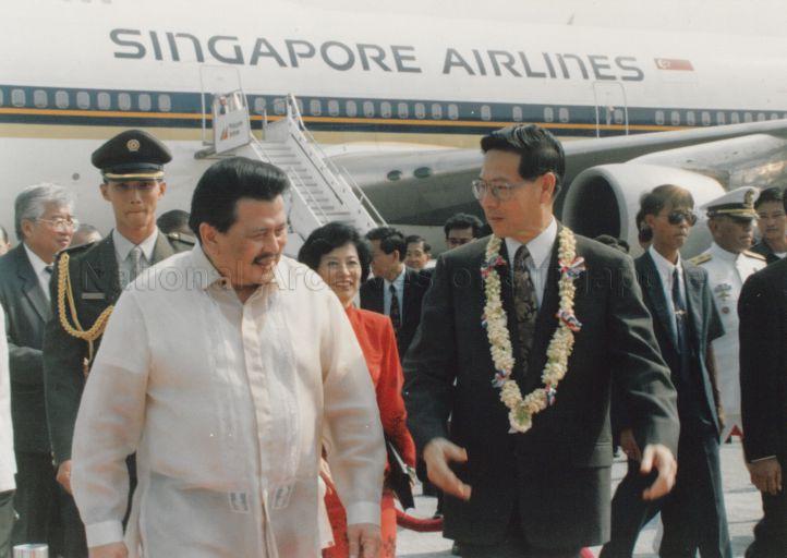 PHILIPPINES VICE-PRESIDENT JOSEPH ESTRADA (LEFT) ACCOMPANYING PRESIDENT ONG TENG CHEONG AND MRS ONG ON THEIR ARRIVAL AT NINOY AQUINO INTERNATIONAL AIRPORT DURING THEIR STATE VISIT TO THE PHILIPPINES FROM 15-19 FEBRUARY 1995.