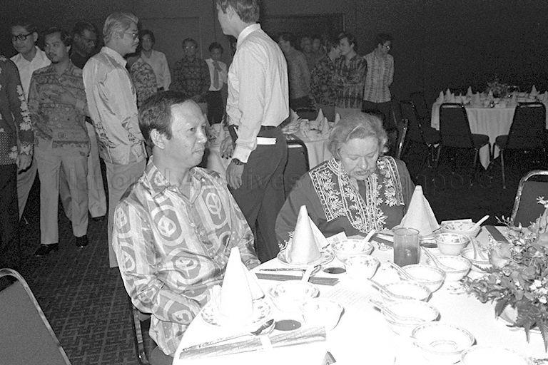 MALAYSIAN DEPUTY PRIME MINISTER OF MALAYSIA DATUK MUSA HITAM WITH MRS S RAJARATNAM, WIFE OF SECOND DEPUTY PRIME MINISTER (FOREIGN AFFAIRS) AT DINNER HELD IN PAVILION INTER-CONTINENTAL HOTEL
