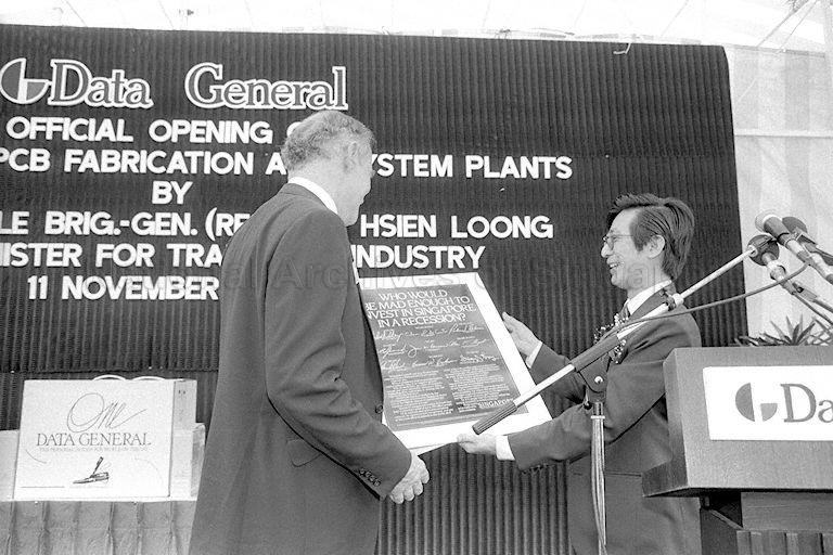 ECONOMIC DEVELOPMENT BOARD (EDB) CHAIRMAN PHILIP YEO AT OFFICIAL OPENING OF COMPUTER SYSTEMS AND PRINTED CIRCUIT BOARD (PCB) PLANTS OF DATA GENERAL MANUFACTURING LTD AT 149A GUL CIRCLE IN JURONG