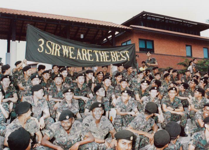 SOLDIERS FROM THE THIRD BATTALION, SINGAPORE INFANTRY REGIMENT (3 SIR) SUPPORTING THEIR UNIT WHICH WON THE BEST COMBAT UNIT TITLE DURING THE SINGAPORE ARMED FORCES (SAF) DAY PARADE 1997 AT SAFTI MILITARY INSTITUTE