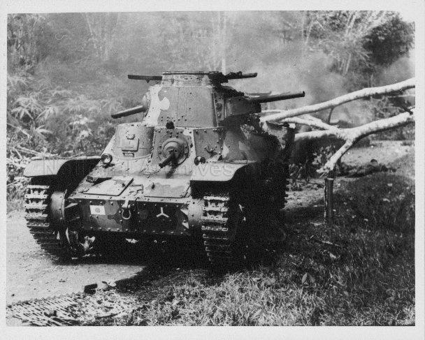 JAPANESE TYPE 95 HA-GO LIGHT TANK HALTED BY AUSTRALIAN ANTI-TANK FIRE, MALAYA.