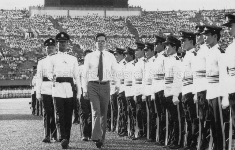 GUEST OF HONOUR ACTING CULTURE MINISTER ONG TENG CHEONG INSPECTING THE GUARD OF HONOUR DURING THE OFFICIAL OPENING OF SINGAPORE YOUTH FESTIVAL 1978 AT THE NATIONAL STADIUM.