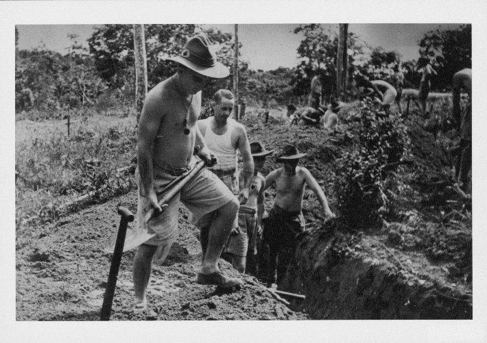 AUSTRALIAN TROOPS IN SINGAPORE: DIGGING UNDERGROUND TRENCHES.