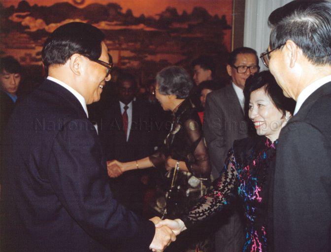 CHINESE PRESIDENT JIANG ZEMIN GREETING MRS ONG,(2ND RIGHT), WIFE OF PRESIDENT ONG TENG CHEONG DURING THE FIRST STOP OF THE STATE VISIT TO BEIJING, THE PEOPLE'S REPUBLIC OF CHINA