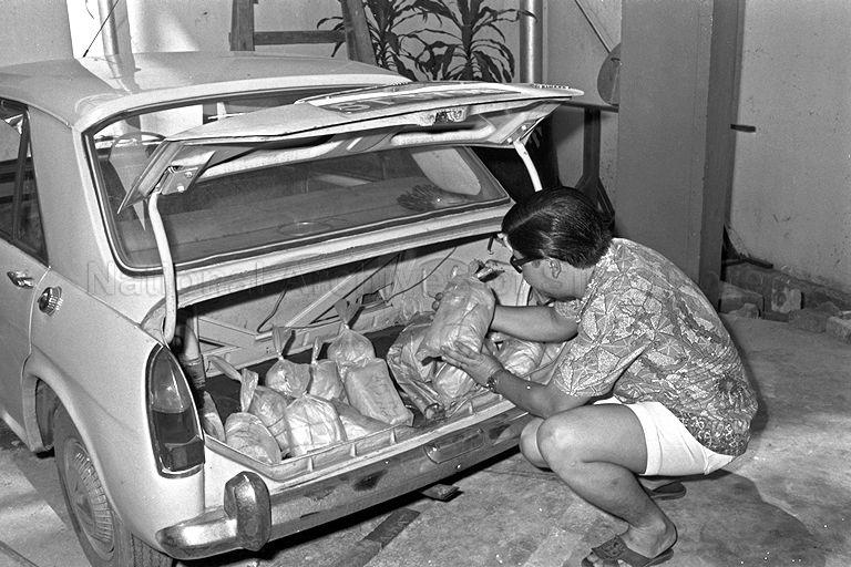 CUSTOMS SMASH OPIUM SMUGGLING GANG IN JURONG WITH THE ARREST OF TWO MEN AND THE SEIZURE OF 47-LB OF RAW OPIUM WORTH $13,000. A CUSTOMS OFFICER EXAMINES THE RAW OPIUM SLABS AT CUSTOMS HOUSE