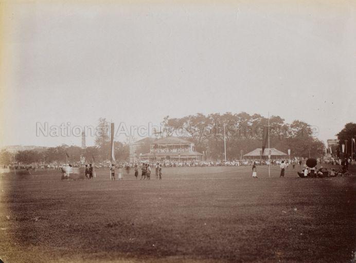 FESTIVAL AT THE SINGAPORE CRICKET CLUB AT PADANG, SHOWING MALAY FOOD PEDDLERS ON THE RIGHT, THE DALHOUSIE OBELISK IN THE BACKGROUND.