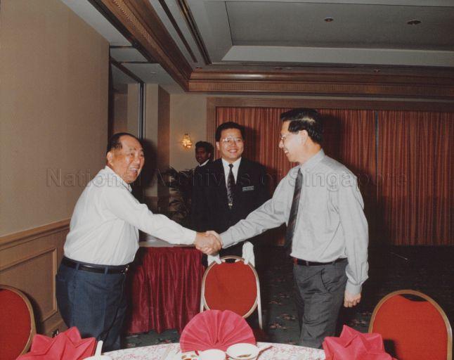 BIRTHDAY LUNCH FOR DR HSU TSE-KWANG, FORMER COMMISSIONER OF INLAND REVENUE, AT ROSE ROOM, YORK HOTEL, JAN 1994. PRESIDENT ONG TENG CHEONG (RIGHT) CONGRATULATING DR HSU