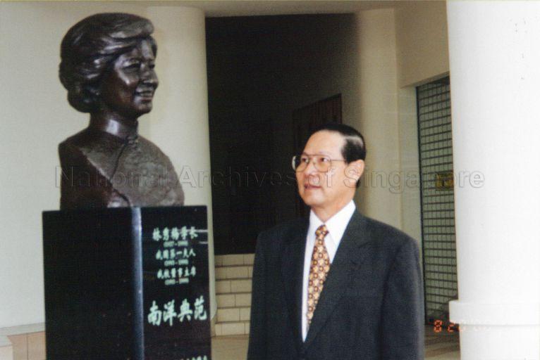 BUST OF LING SIEW MAY BY SCULPTOR CHEN LIAN SHAN, AUG 2000. FORMER PRESIDENT ONG TENG CHEONG POSING WITH THE BUST OF WIFE LING SIEW MAY IN NANYANG GIRLS' HIGH SCHOOL AUDITORIUM.