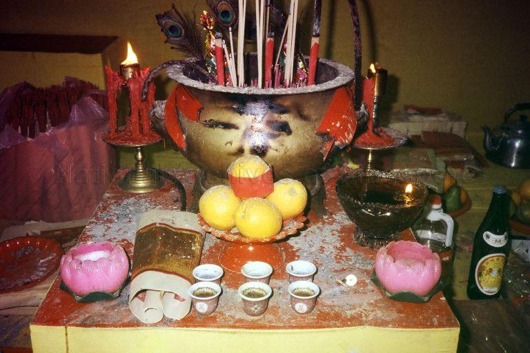A SIMPLE TAOIST ALTAR SET UP WITH TEA AND FRUIT OFFERINGS