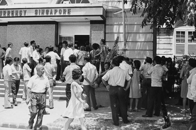 CROWDS QUEUEING UP AT EMPRESS PLACE FOR THE 10TH ANNIVERSARY OF SINGAPORE'S INDEPENDENCE GOLD COIN AT BOARD OF COMMISSIONERS OF CURRENCY, SINGAPORE
