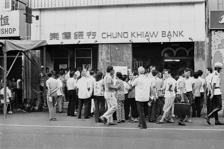 BANK RUN AT THE CHUNG KHIAW AND UNITED OVERSEAS BANKS WHERE PEOPLE QUEUED UP FOR WITHDRAWAL