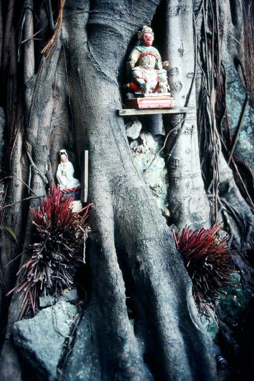 STATUES OF "KWAN YIN" THE GODDESS OF MERCY AND THE MONKEY GOD "SUN WU KONG" PLACED IN THE HOLLOWS OF A TREE