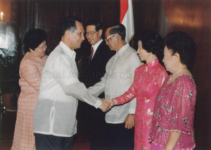 PHILIPPINES NATIONAL POLICE CHIEF RECAREDO SARMIENTO AND HIS WIFE GREETING PRESIDENT ONG TENG CHEONG, PHILIPPINES PRESIDENT FIDEL V RAMOS AND MRS ONG AT MALACANANG PALACE DURING STATE BANQUET FOR PRESIDENT AND MRS ONG WHO ARE ON A STATE VISIT TO THE PHILIPPINES FROM 15-19 FEBRUARY 1995. LOOKING ON IS PHILIPPINES FIRST LADY MRS AMELITA M RAMOS.