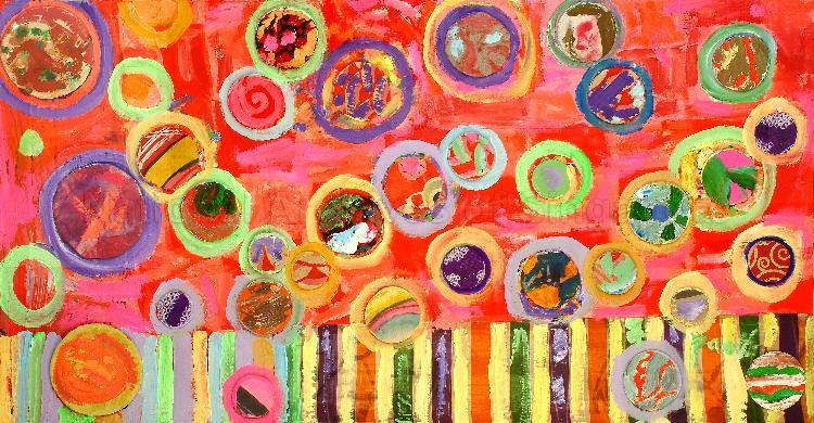 CIRCLE COLLAGES SERIES ART TITLED 'MARBLES IN A PIN-STRIPED BOX', ACRYLIC, OIL PASTEL, FABRIC, CARDBOARD, PAINTED PAPER COLLAGED ON HANDMADE PAPER