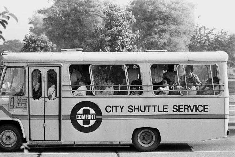 CITY SHUTTLE SERVICE BUSES WITH STANDING PASSENGERS ALONG KALLANG AIRPORT ROAD