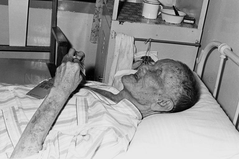 A RESIDENT AT THE HOME FOR THE AGED, LITTLE SISTERS OF THE POOR AT UPPER THOMSON ROAD, APPRECIATING HIS GIFT FROM MRS TAN CHIN TUAN DURING HER VISIT