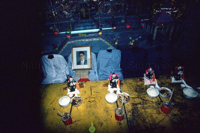 PAPER ARTEFACTS AND EFFIGIES -- PAPER EFFIGIES WITH SIMPLE OFFERINGS ARE PLACED WITH A PHOTOGRAPH OF THE DECEASED AND HIS CLOTHES DRAPED OVER CHAIRS AT FUNERAL WAKE