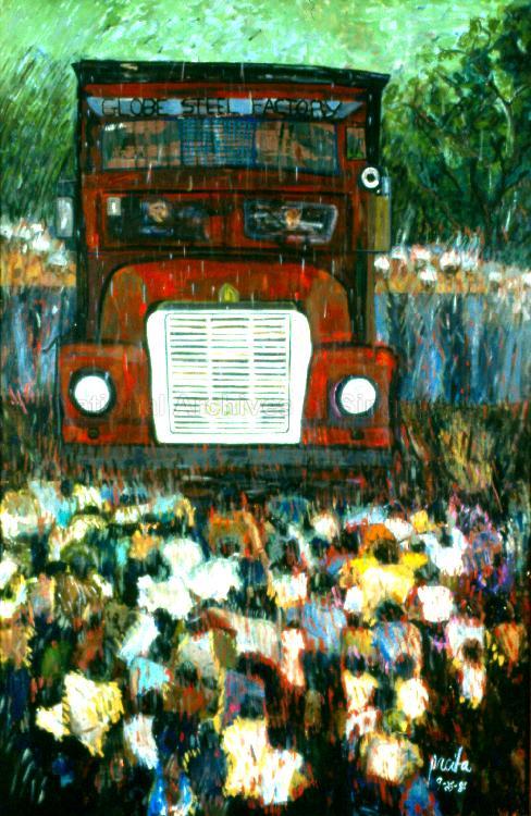 SOCIAL JUSTICE SERIES ART TITLED 'GLOBE STEEL FACTORY', ACRYLIC ON STITCHED AND PADDED MUSLIN